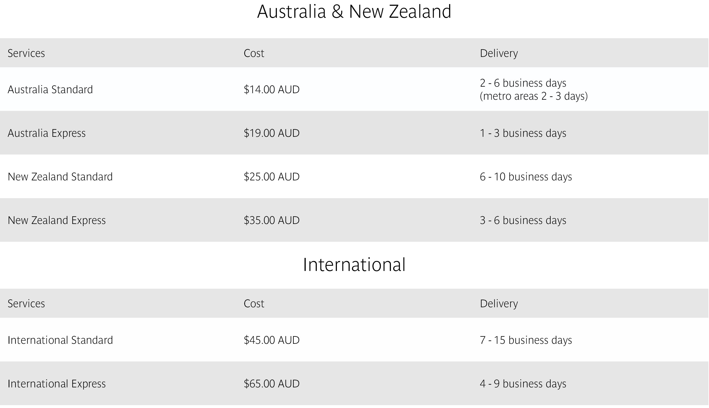 International: Duties, taxes, and customs fees are the recipient’s responsibility. If a parcel returns due to unpaid duties, wrong address, or being unclaimed, we deduct return costs (minimum AUD $15) and any customs charges from your refund.